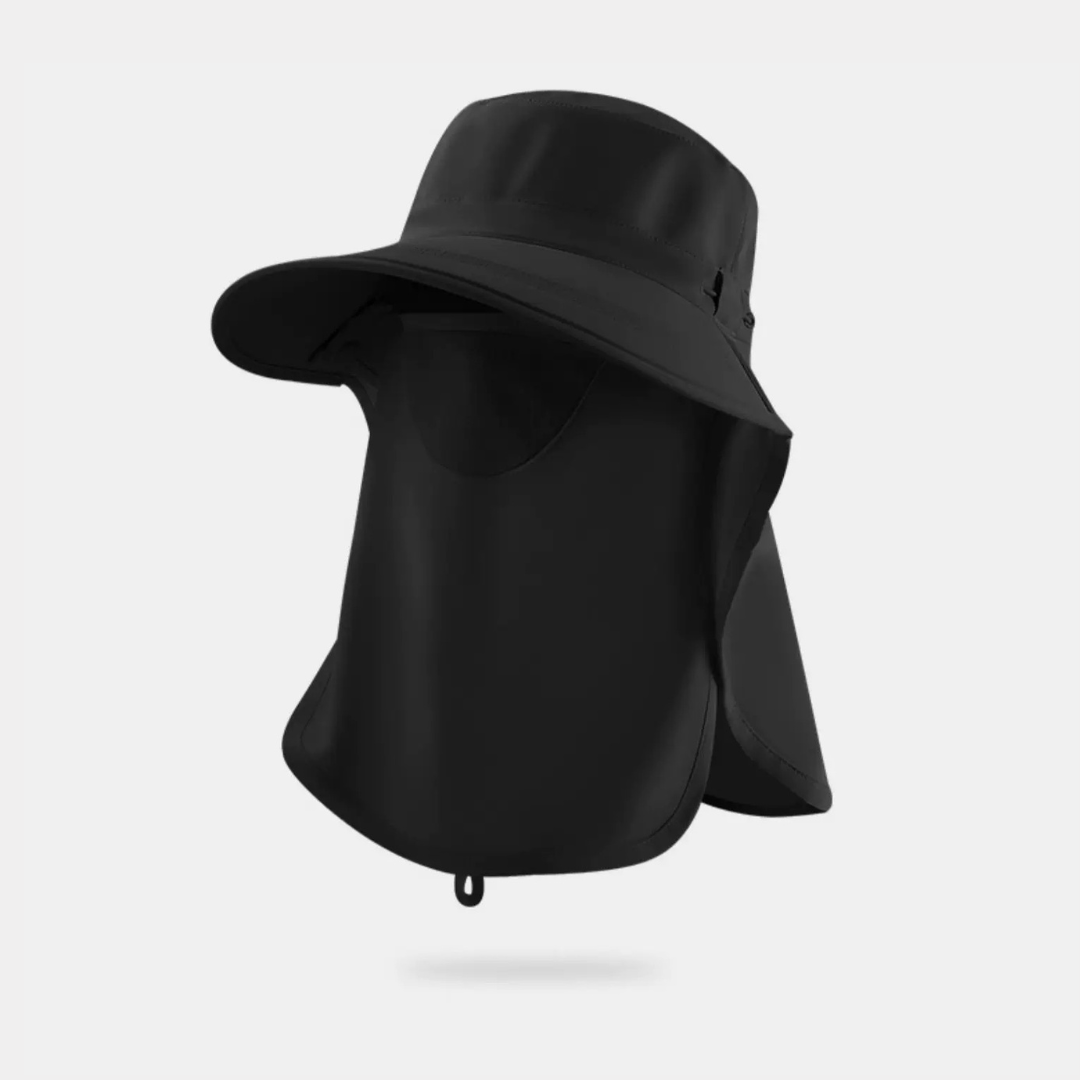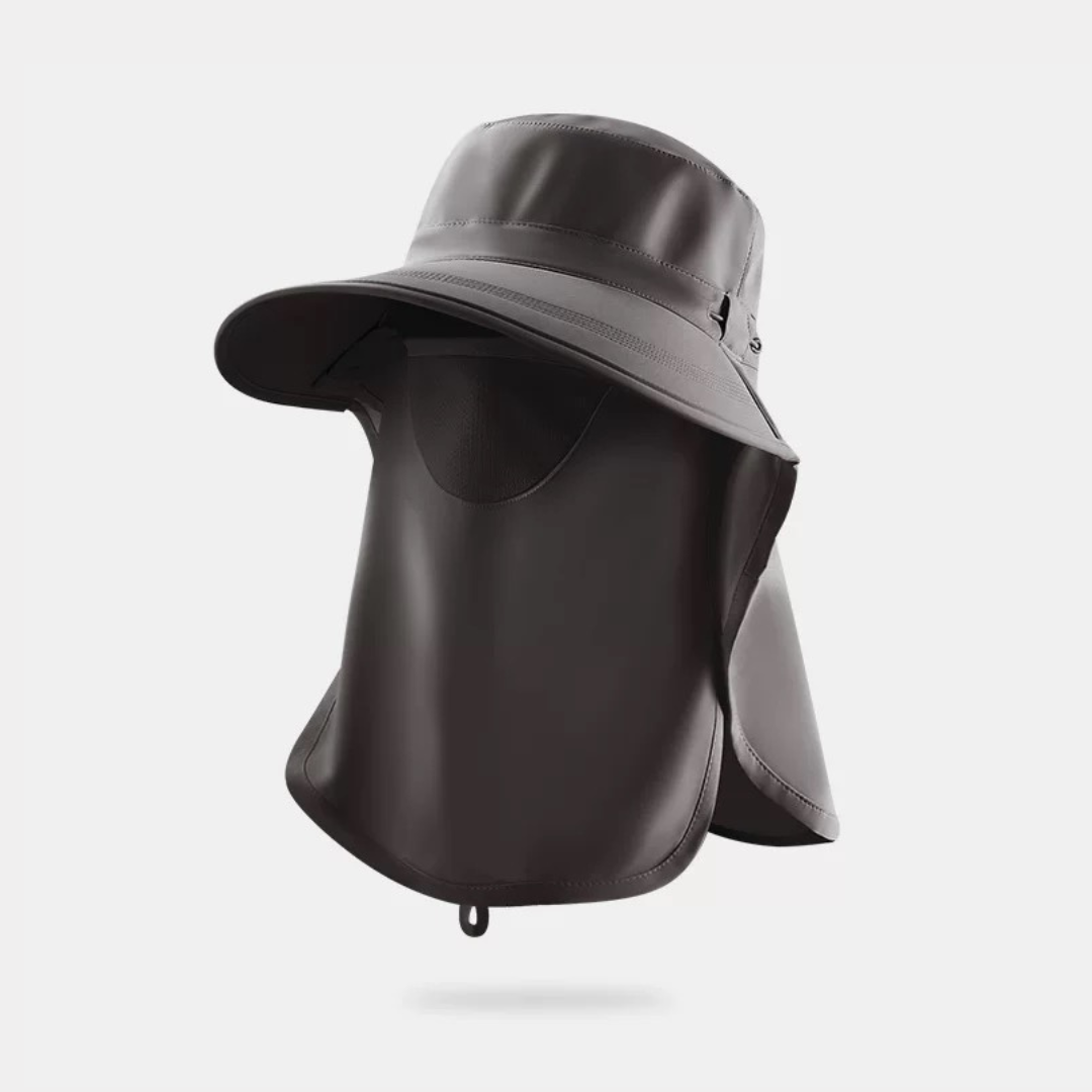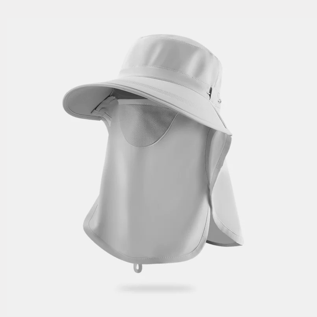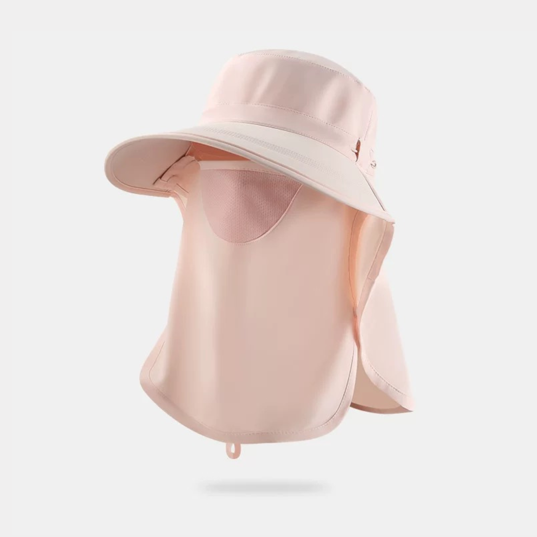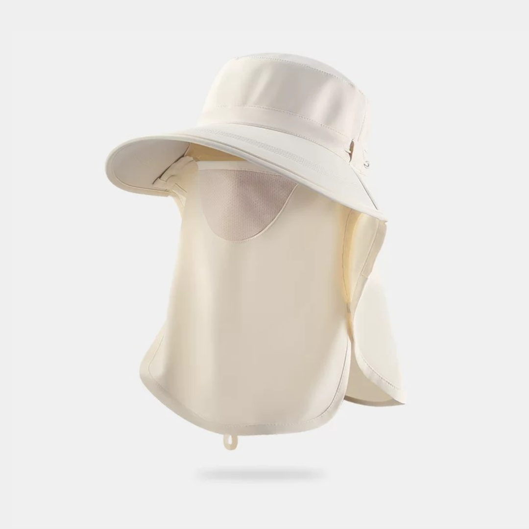 顔まわりから首元までしっかり覆える、上品な印象のUVカットハットです。