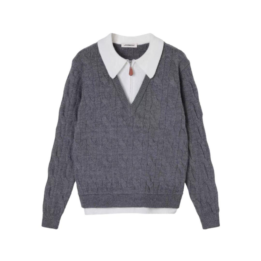 クラシカルなケーブル編みに、ポロ襟×ジップのスポーティさを掛け合わせたニットトップス。