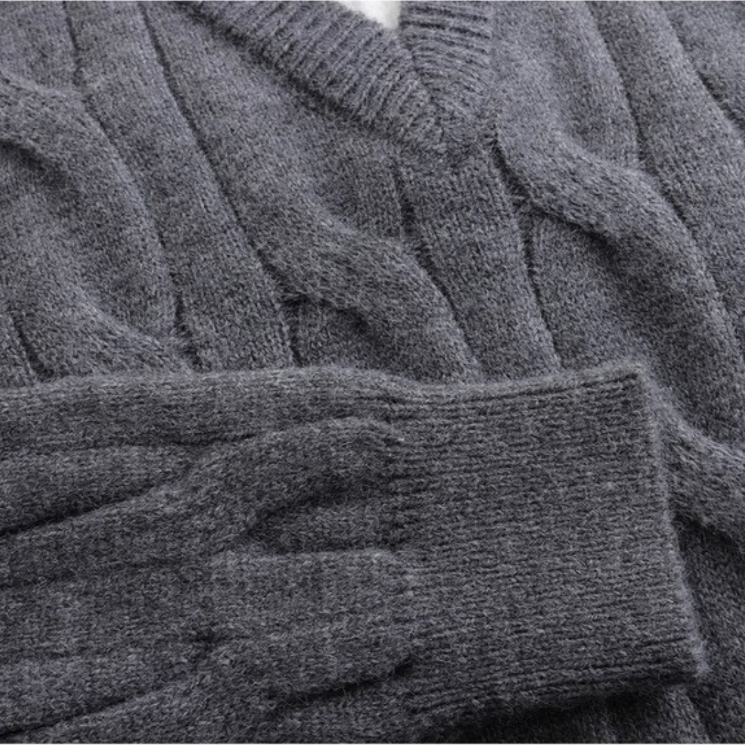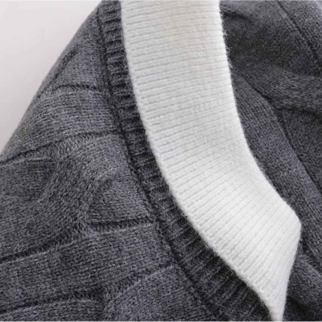 立体感のある編み柄が上半身をすっきり見せ、グレーの落ち着きカラーで大人のプレッピームードに。