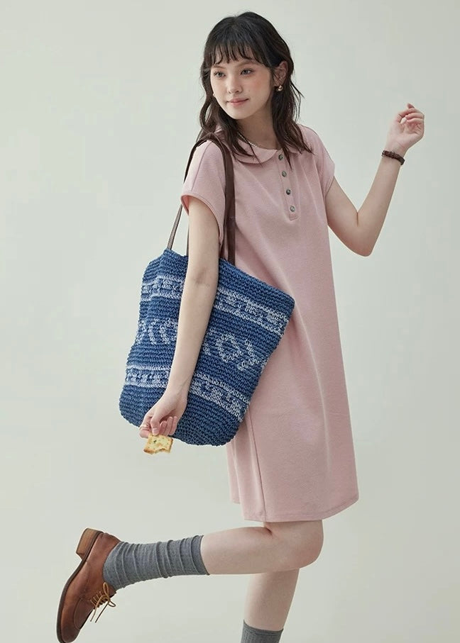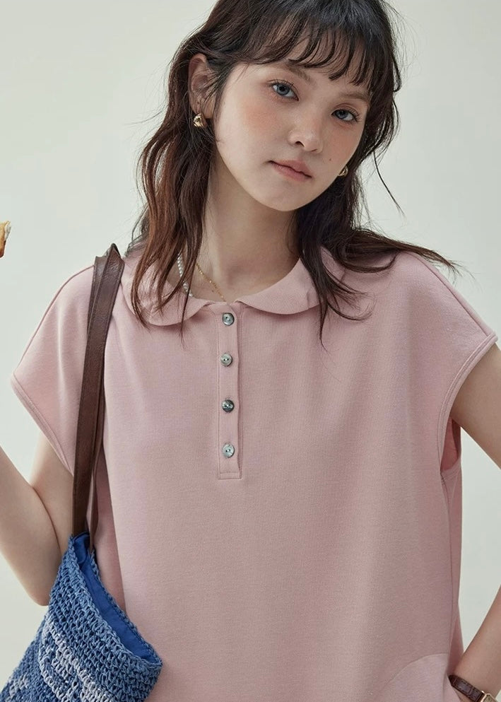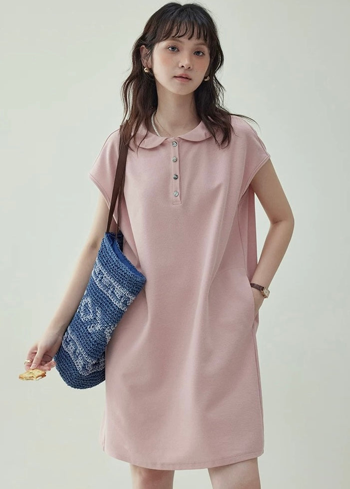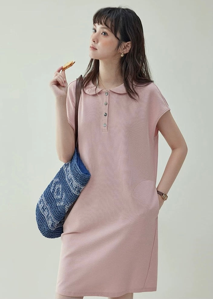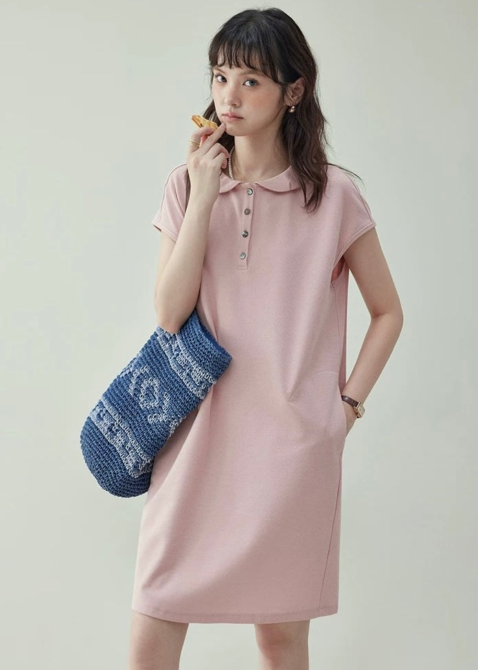 やわらかなピンクが映える、ポロ襟デザインのリラクシーワンピース。