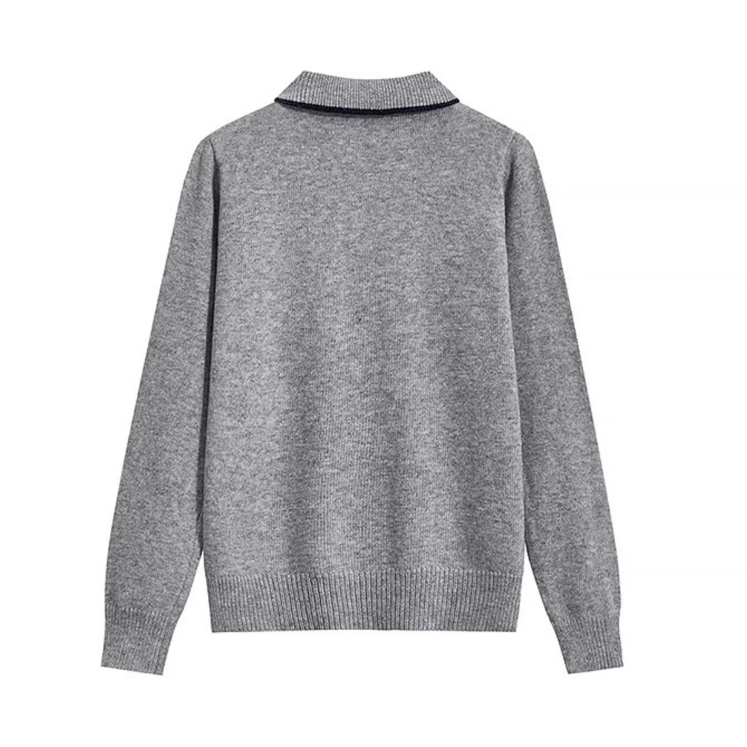 ネイビーのトリミングを効かせた大きめカラーとタイデザインが、顔周りをすっきり見せつつプレッピーなムードをプラスします。