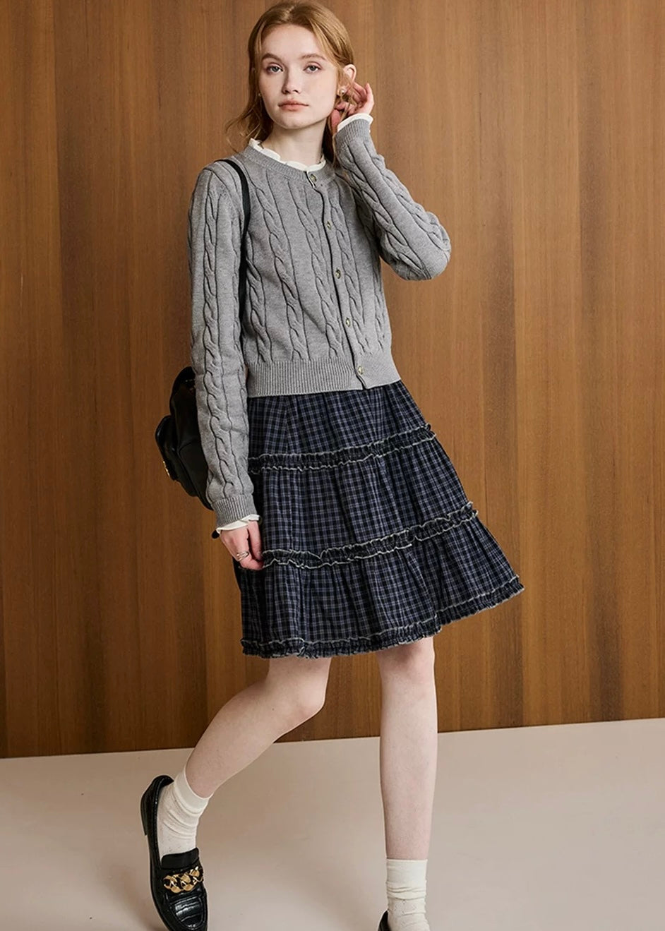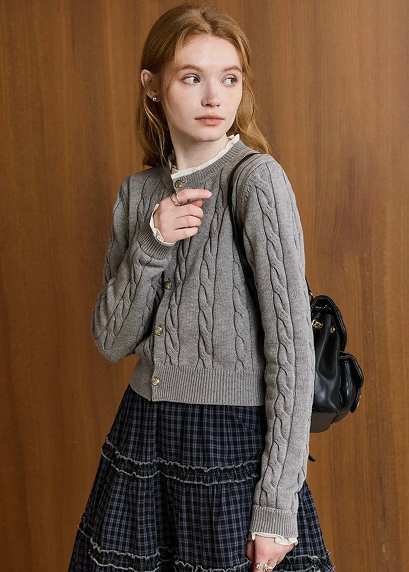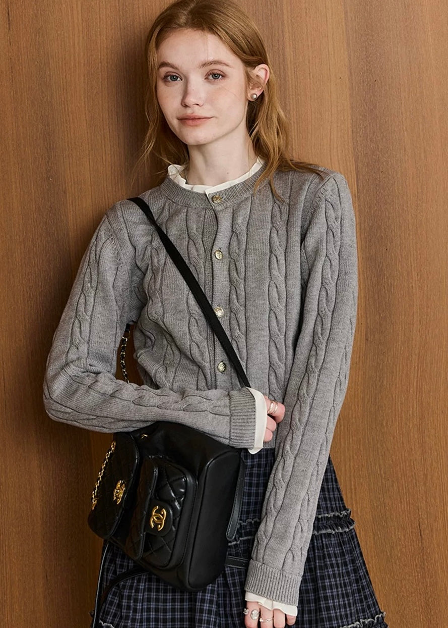 立体感のあるケーブル編みが目を惹く、クラシカルなニットカーディガン。