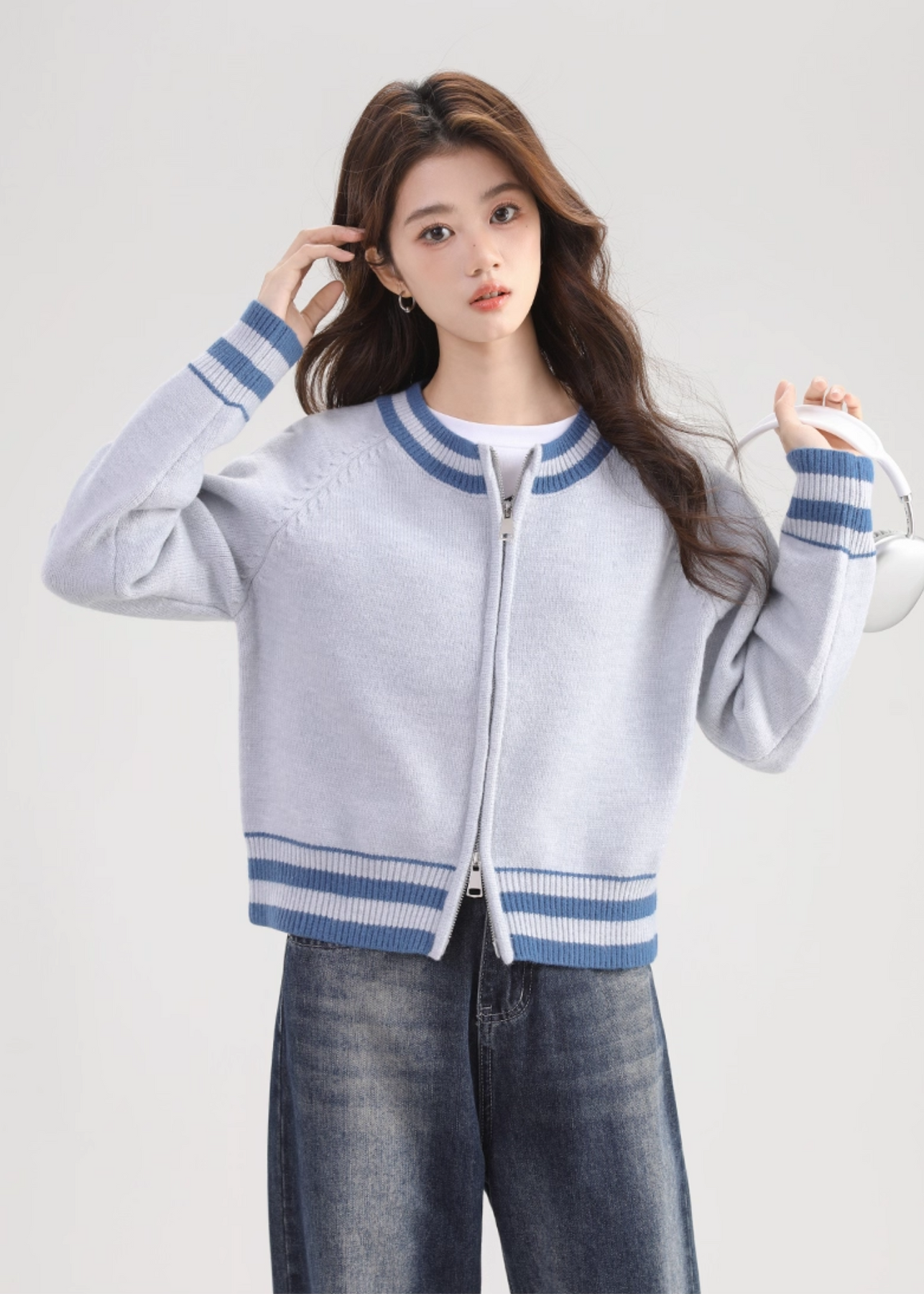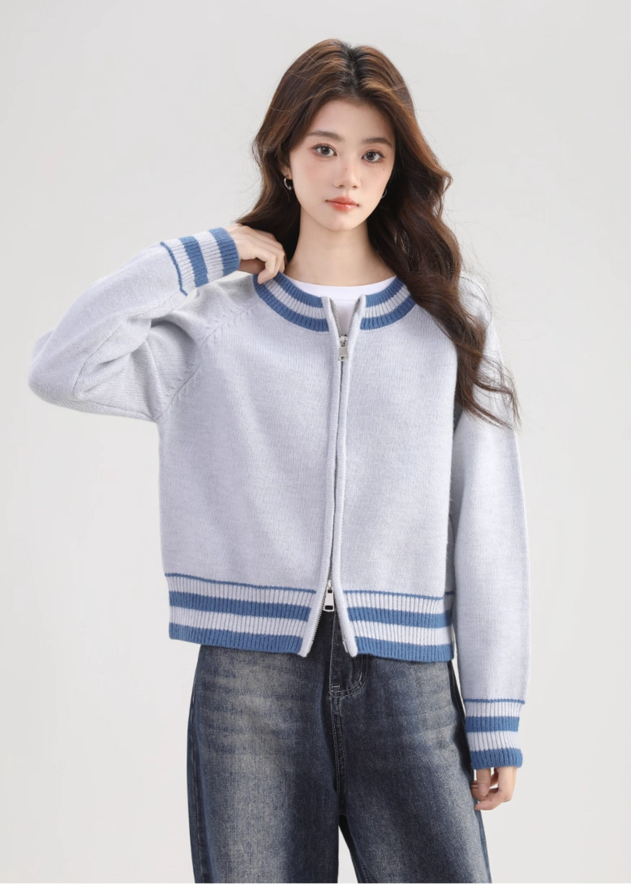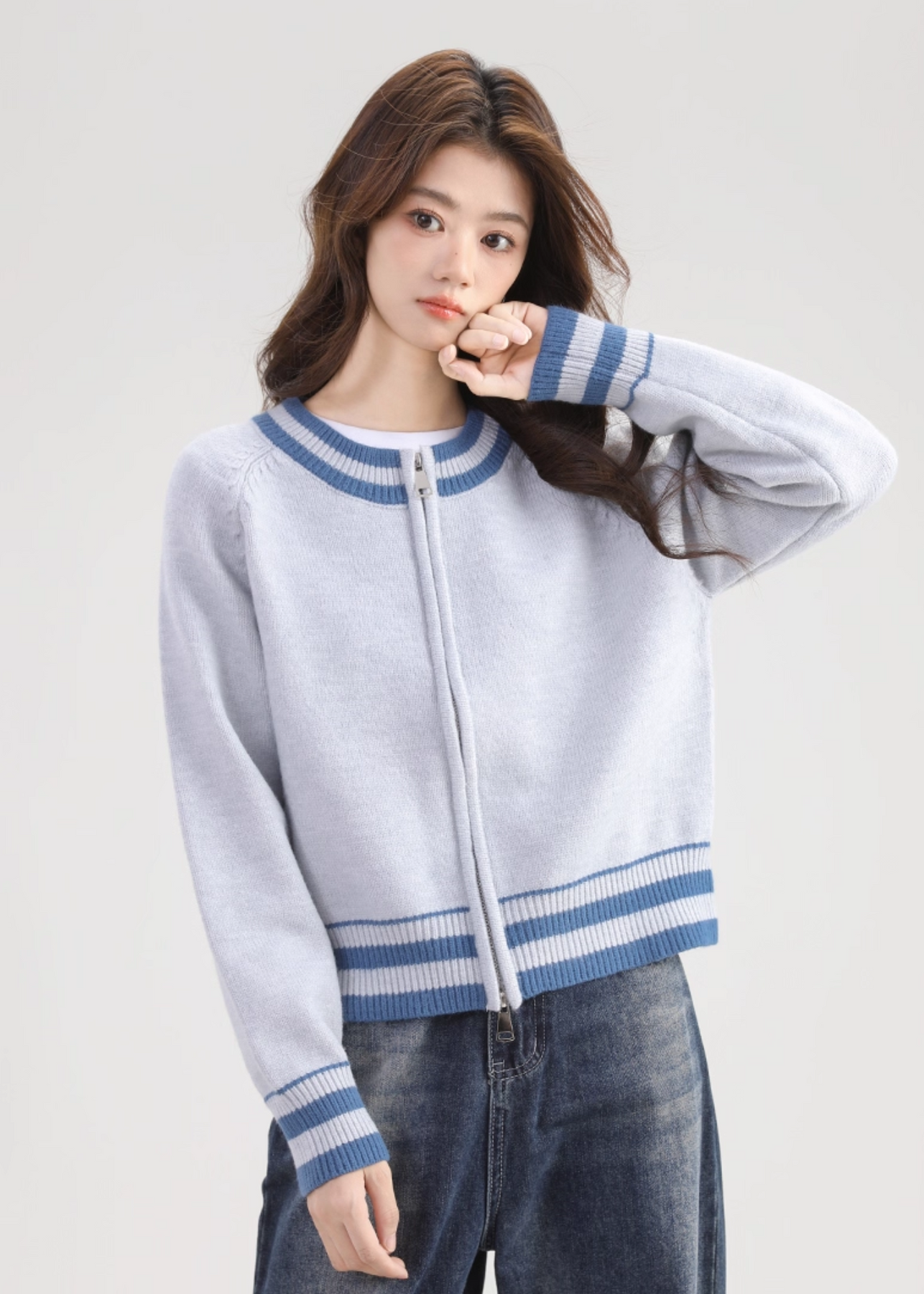淡いグレーにブルーのラインを効かせた、爽やかなジップアップカーディガン。