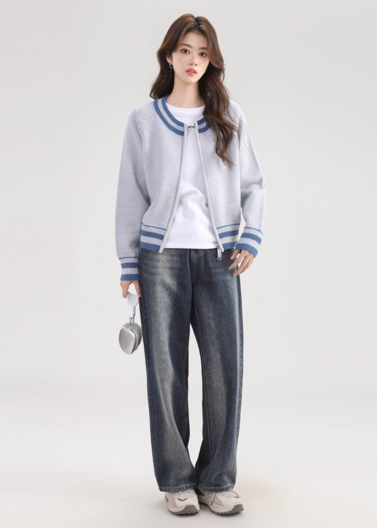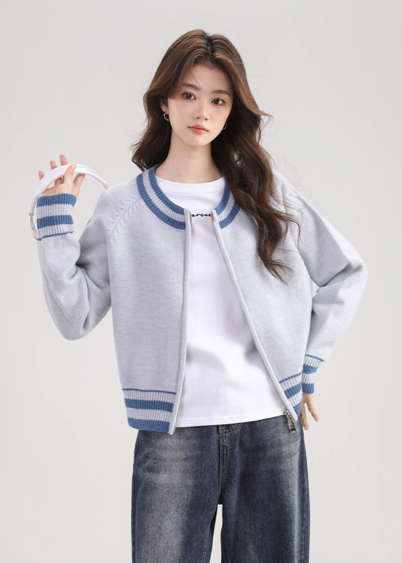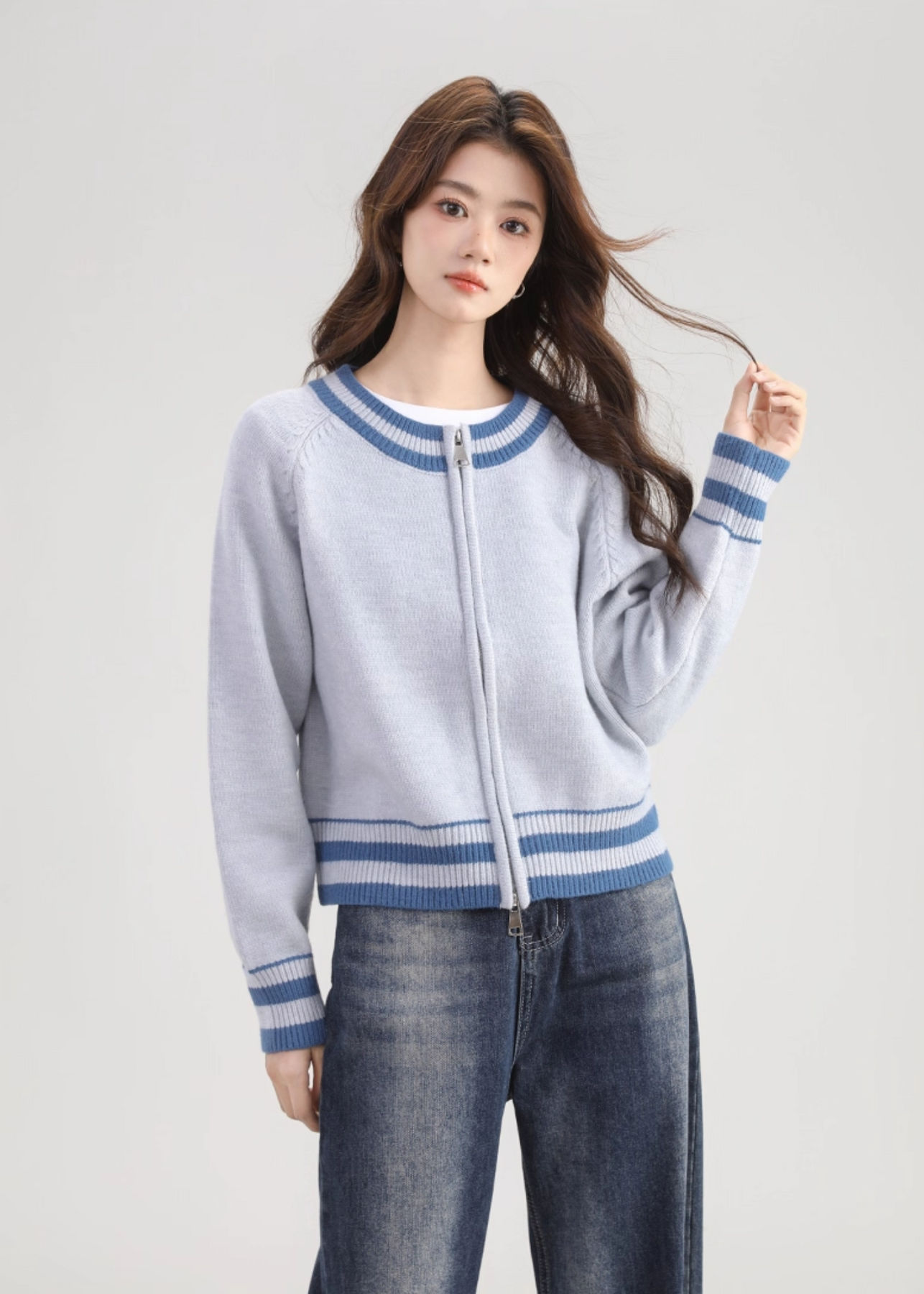 淡いグレーにブルーのラインを効かせた、爽やかなジップアップカーディガン。