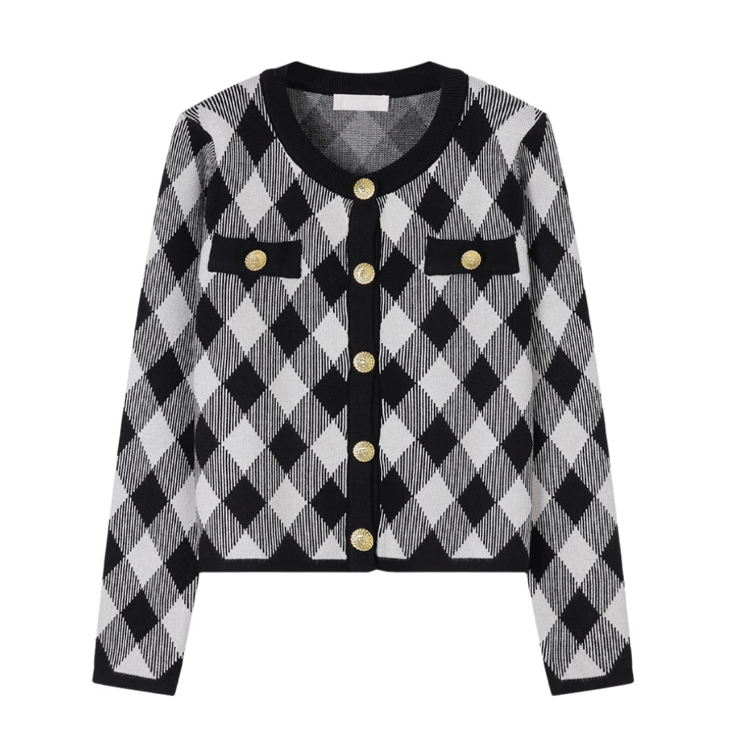 ゴールドボタンが高級感を添え、モノトーンの配色が大人の洗練された雰囲気を演出。