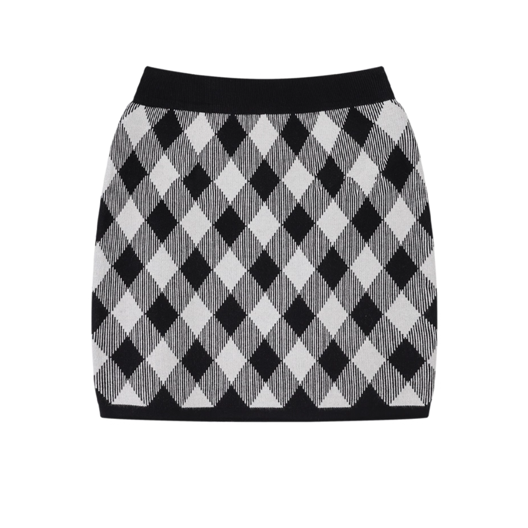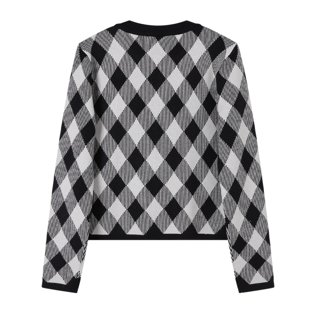 クラシカルなアーガイル柄が印象的なニットセットアップ。