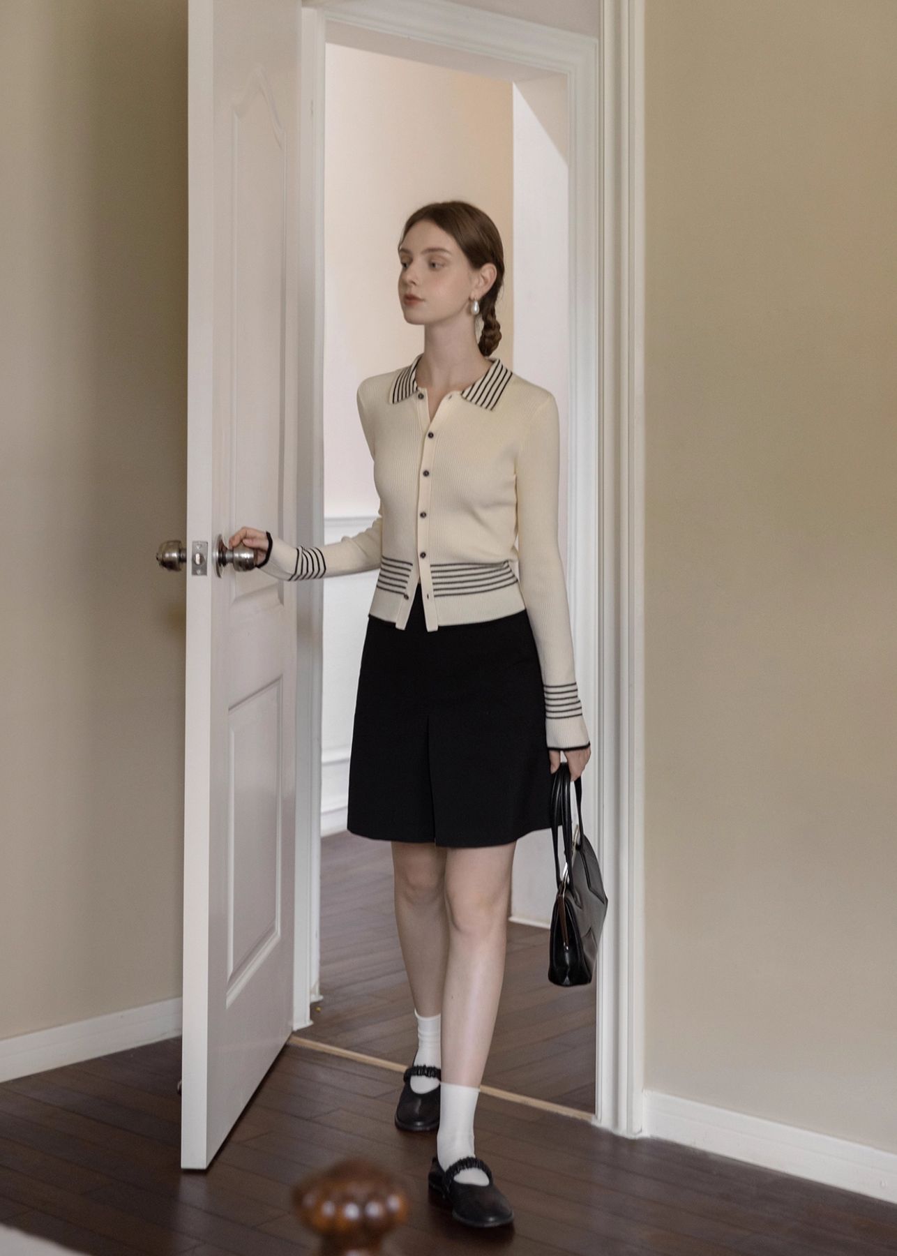 襟元と袖口のストライプラインが上品なアクセントを添えるリブニットカーディガン。