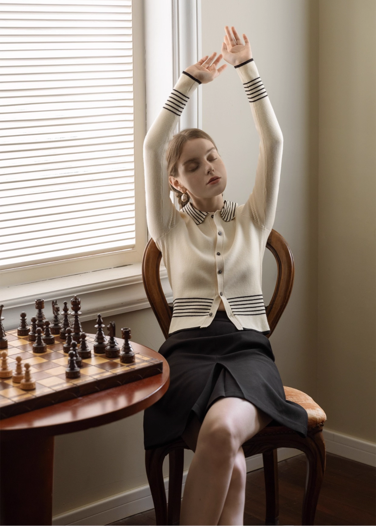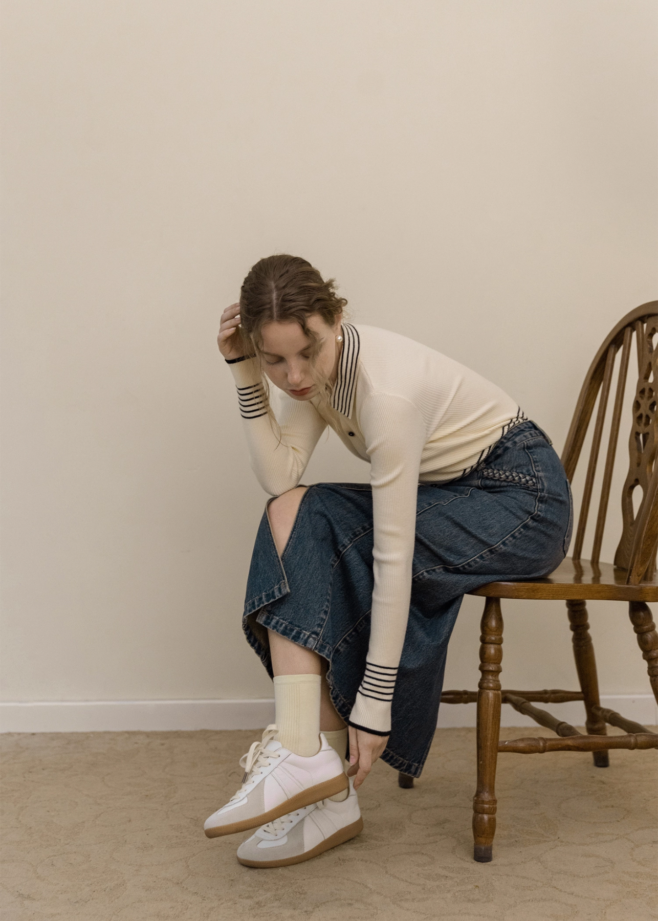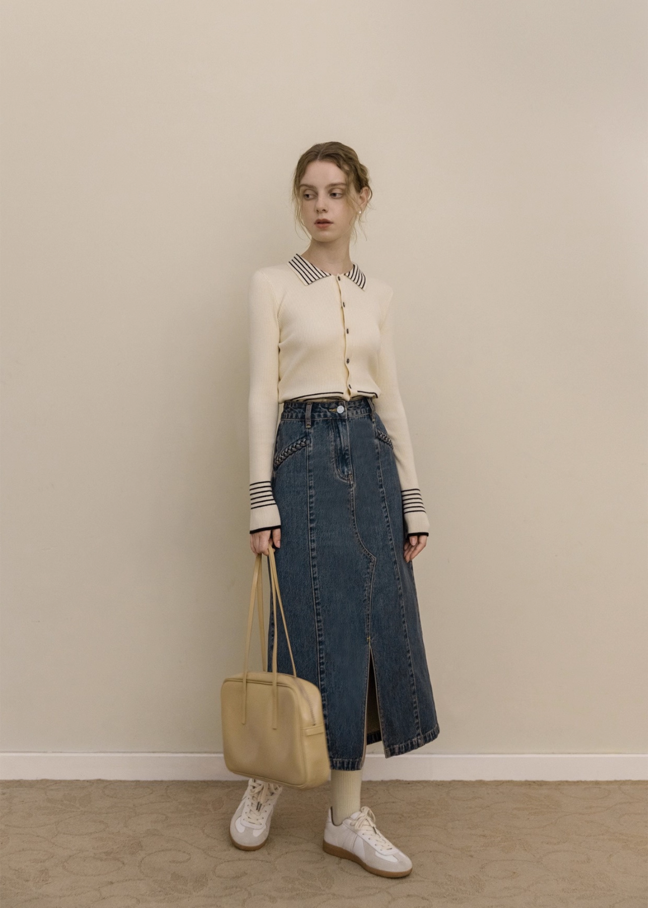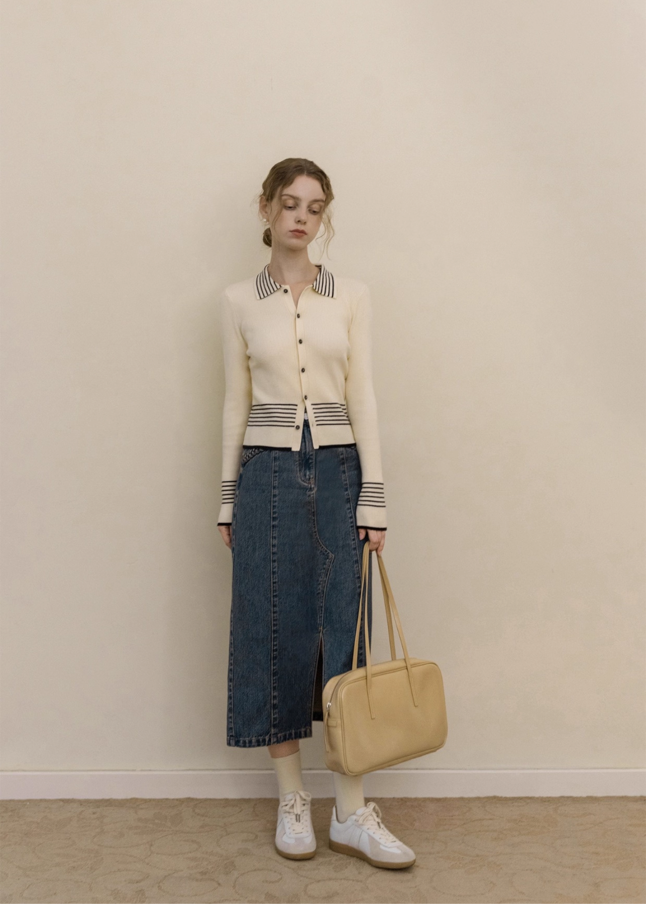 シンプルなボトムに合わせるだけで、上品トラッドな印象を叶えます。