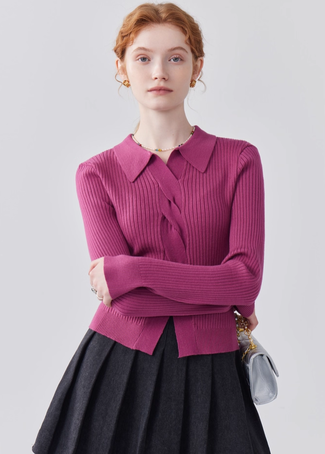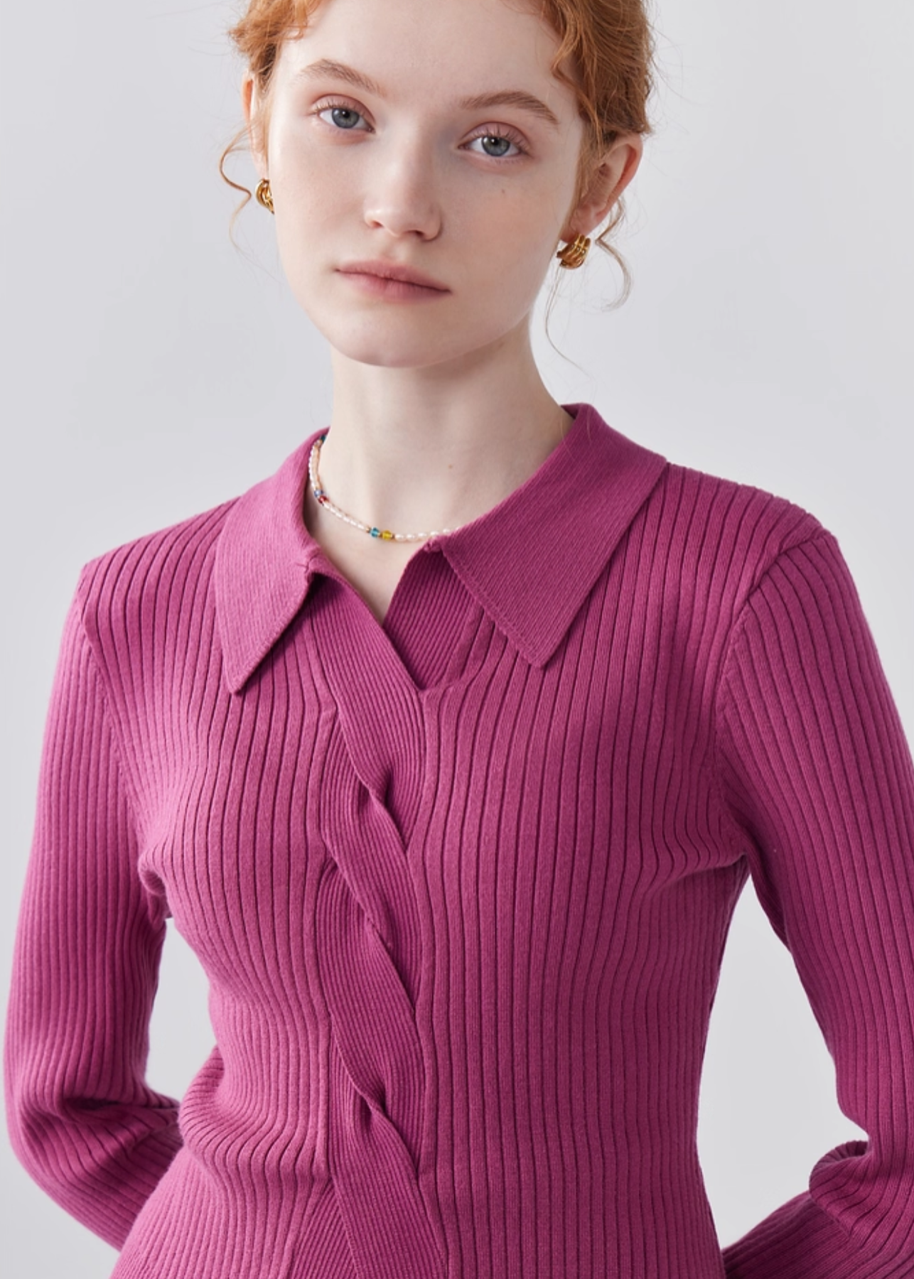 胸元のツイストデザインが目を引く、上品な印象のリブニットトップス。