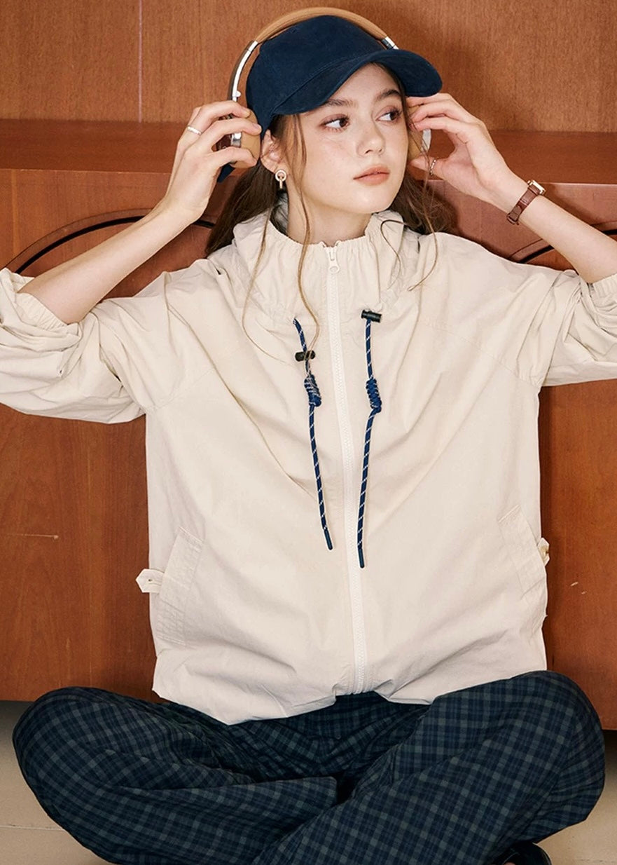 UPF40+の防護力に加え、ドロスト付きの立ち襟が首元までフィットして風の侵入をスマートにブロックします。