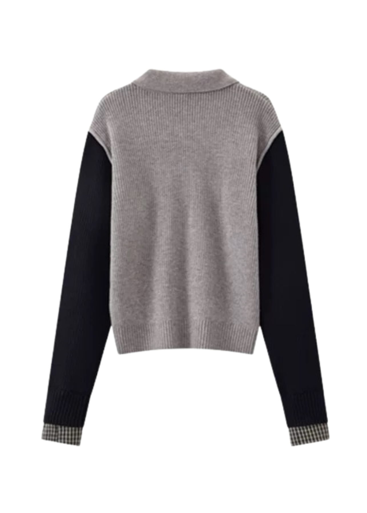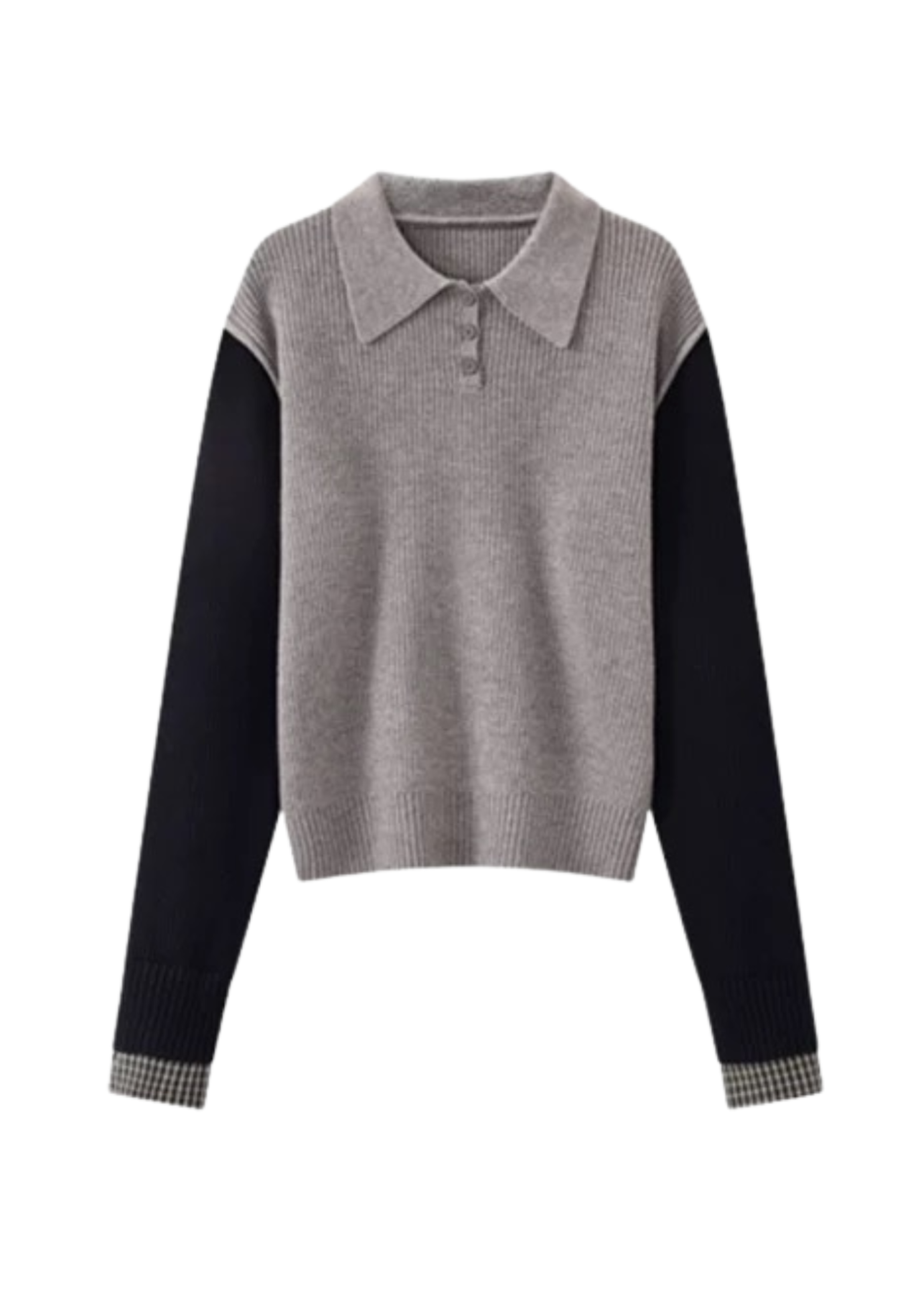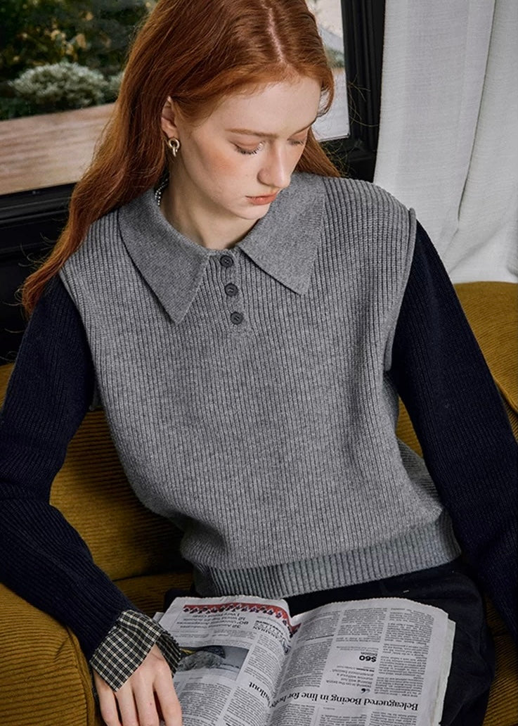 グレー×ネイビーのバイカラーが映える、クラシックムードの襟付きニットポロ。