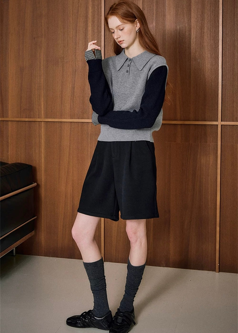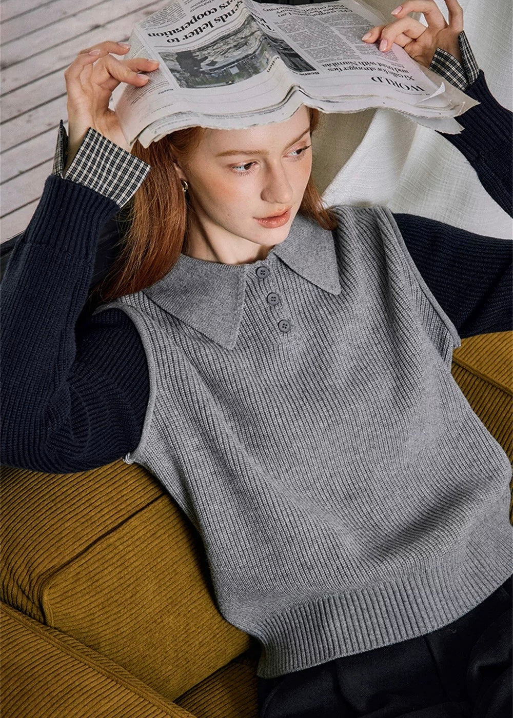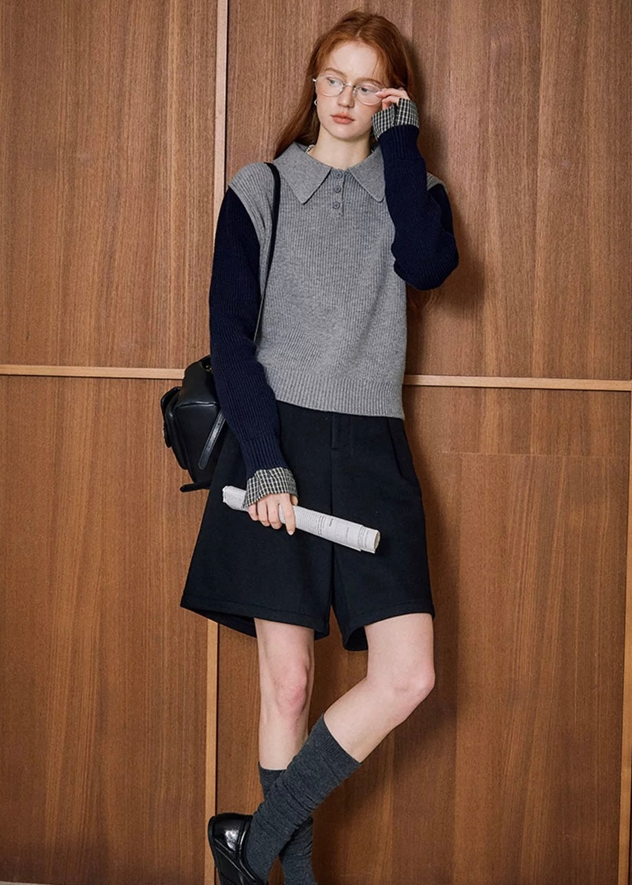 グレー×ネイビーのバイカラーが映える、クラシックムードの襟付きニットポロ。