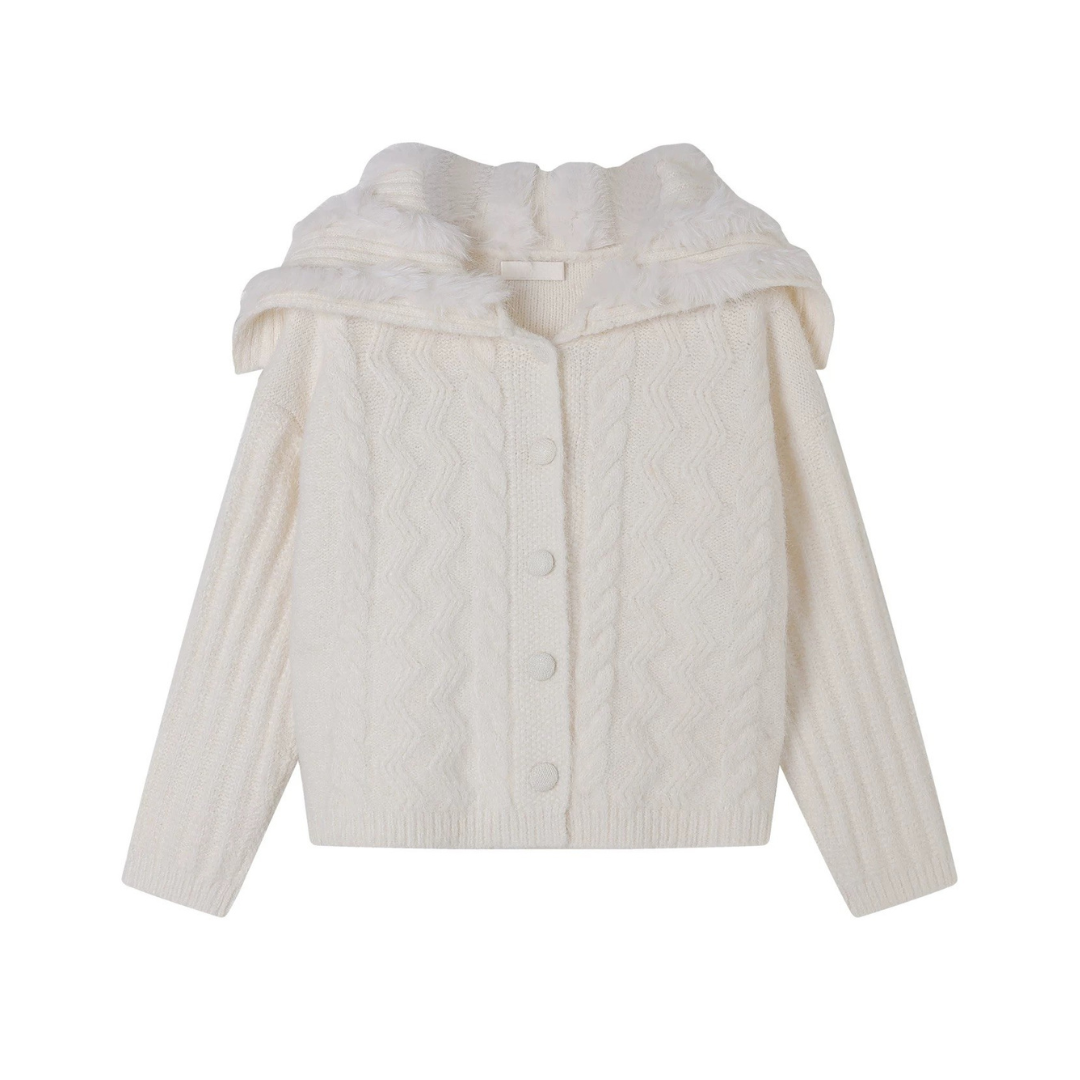 ふんわりファー×ケーブル編みが目を惹く、冬コーデの主役になるあったかカーディガンです。