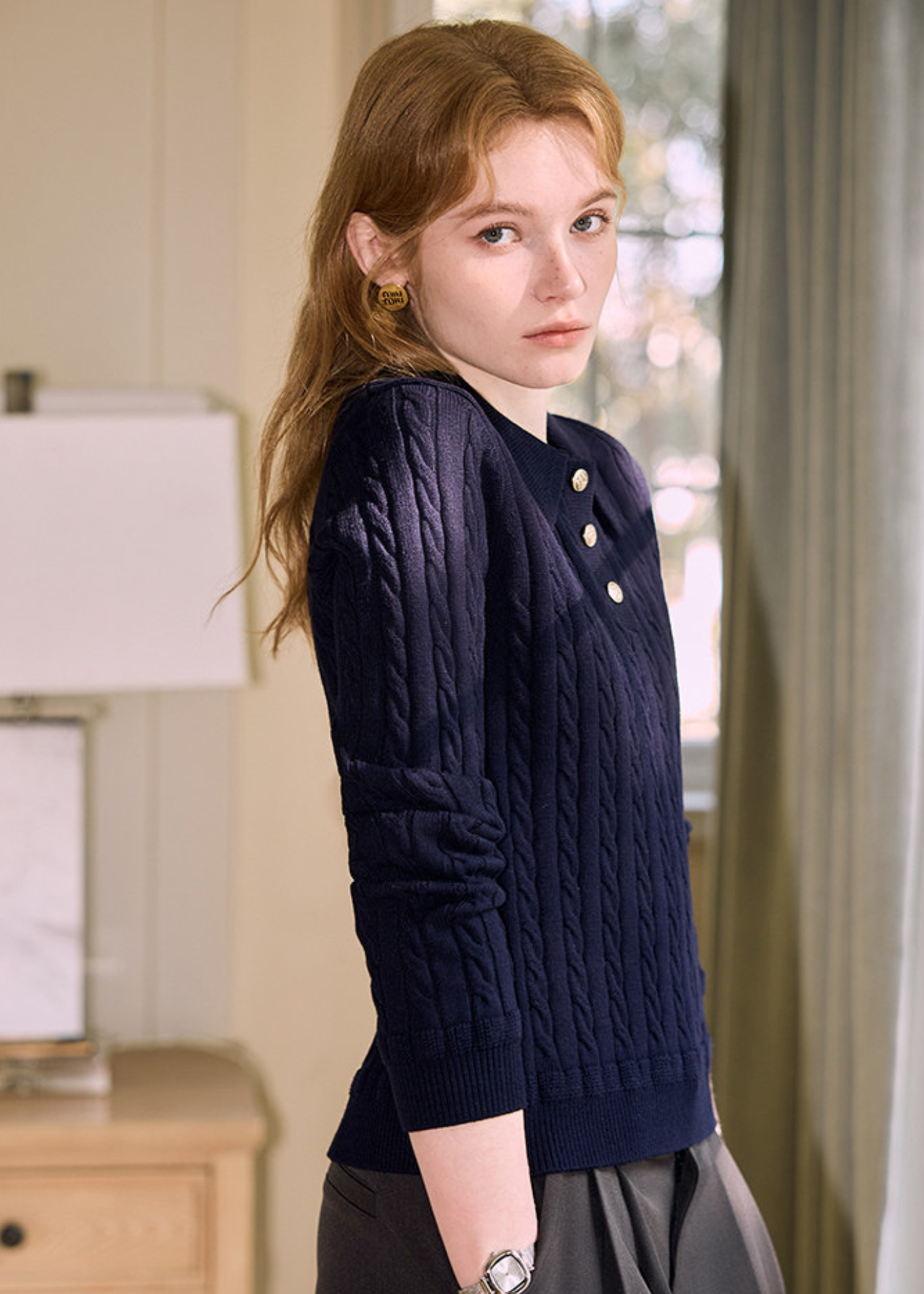 立体感のあるケーブル模様がクラシックな印象を与え、季節を問わずどんなスタイリングにも馴染みます。