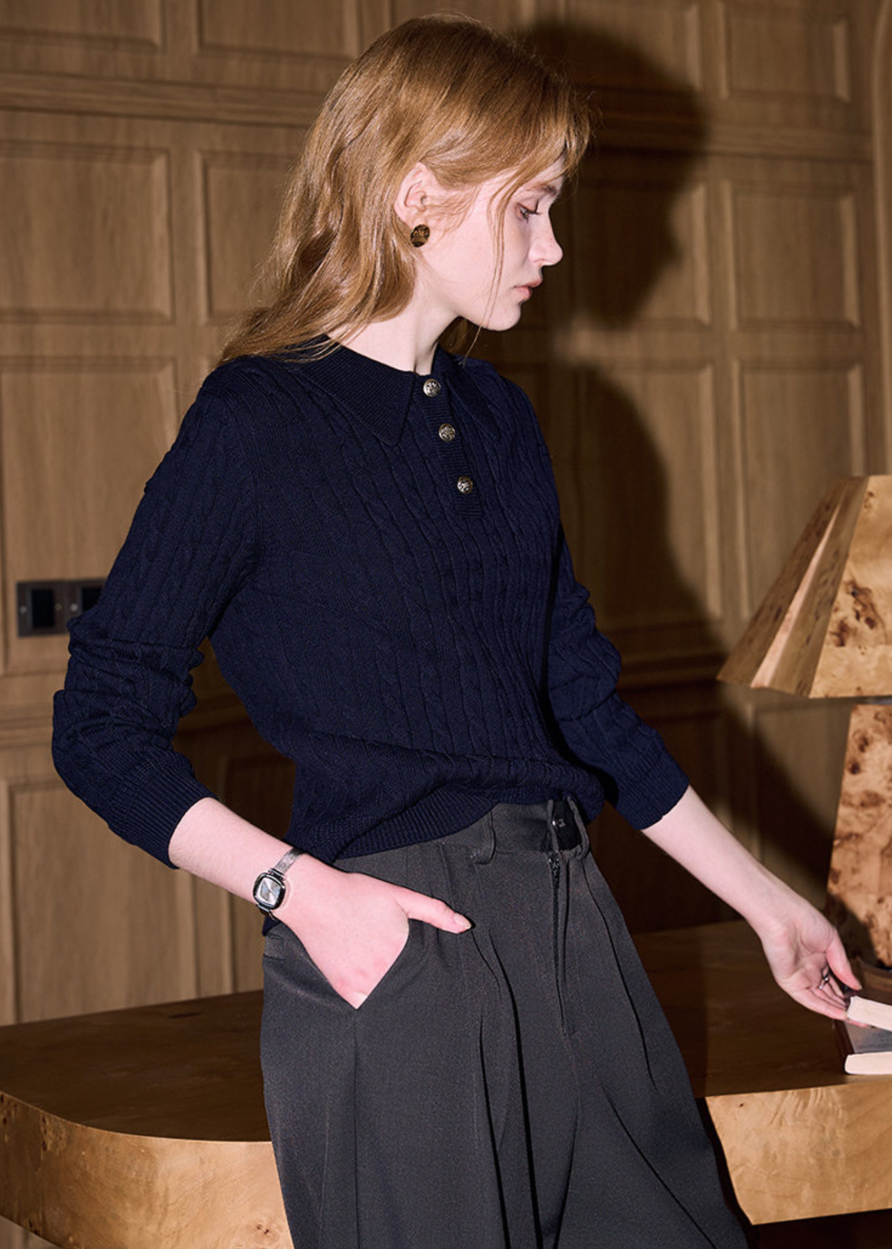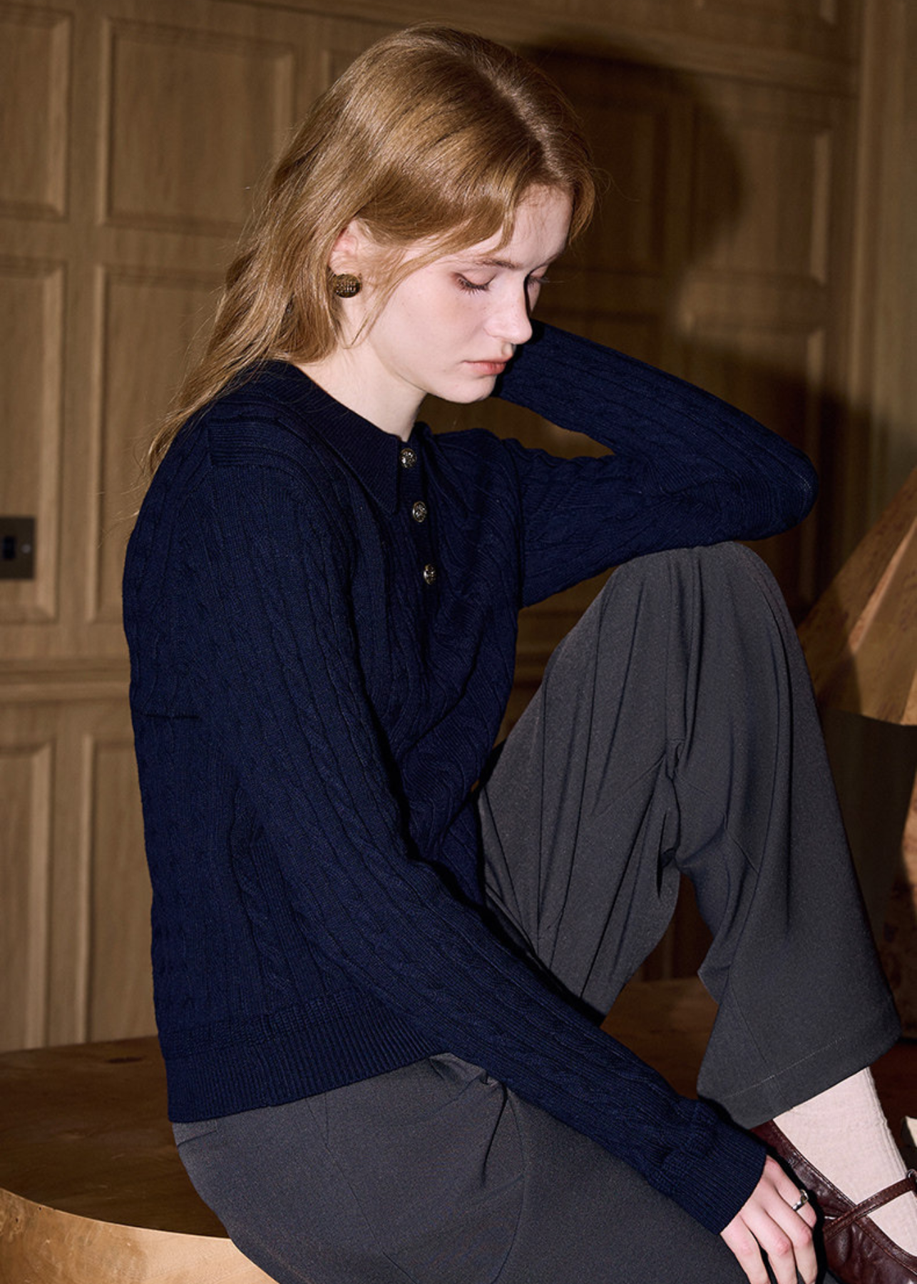 上品なネイビーカラーが魅力のケーブル編みニットトップス。