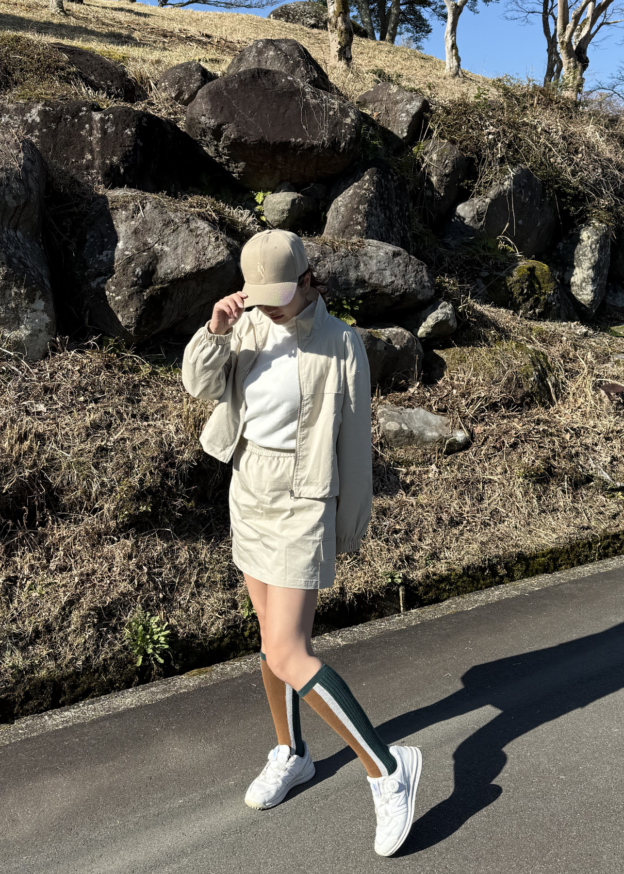軽やかなジップジャケットとミニスカートがセットになった、こなれ感たっぷりの大人カジュアルセットアップです。