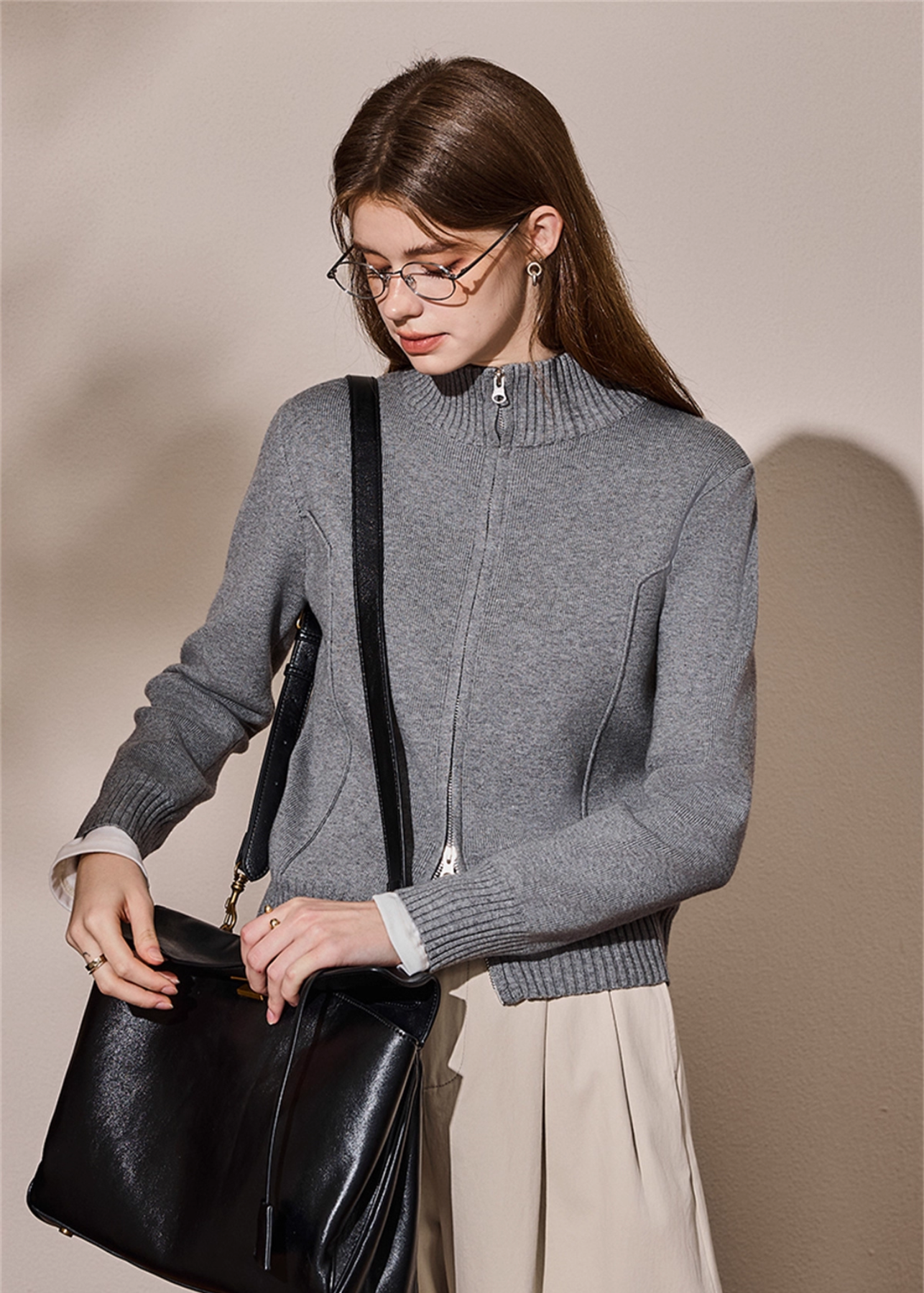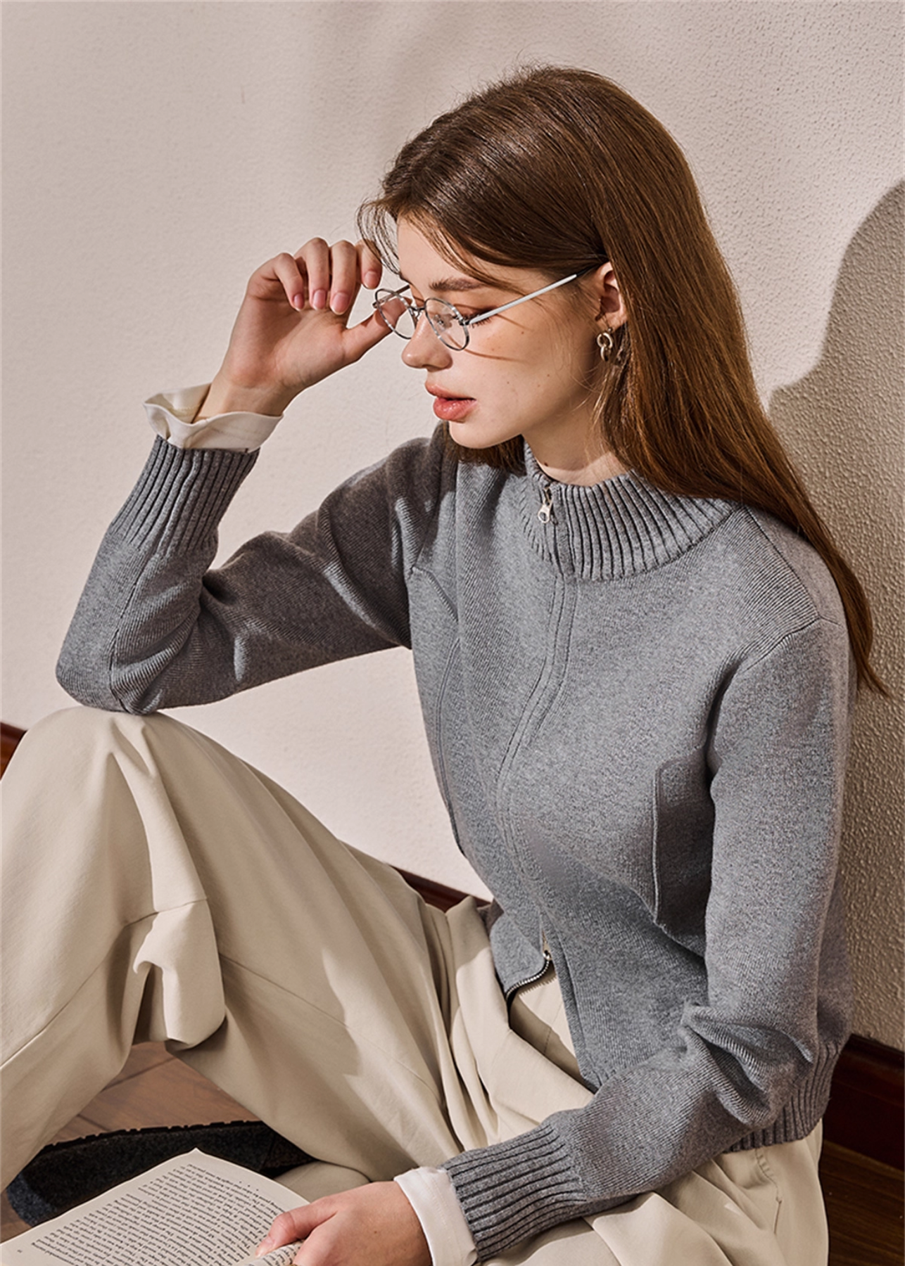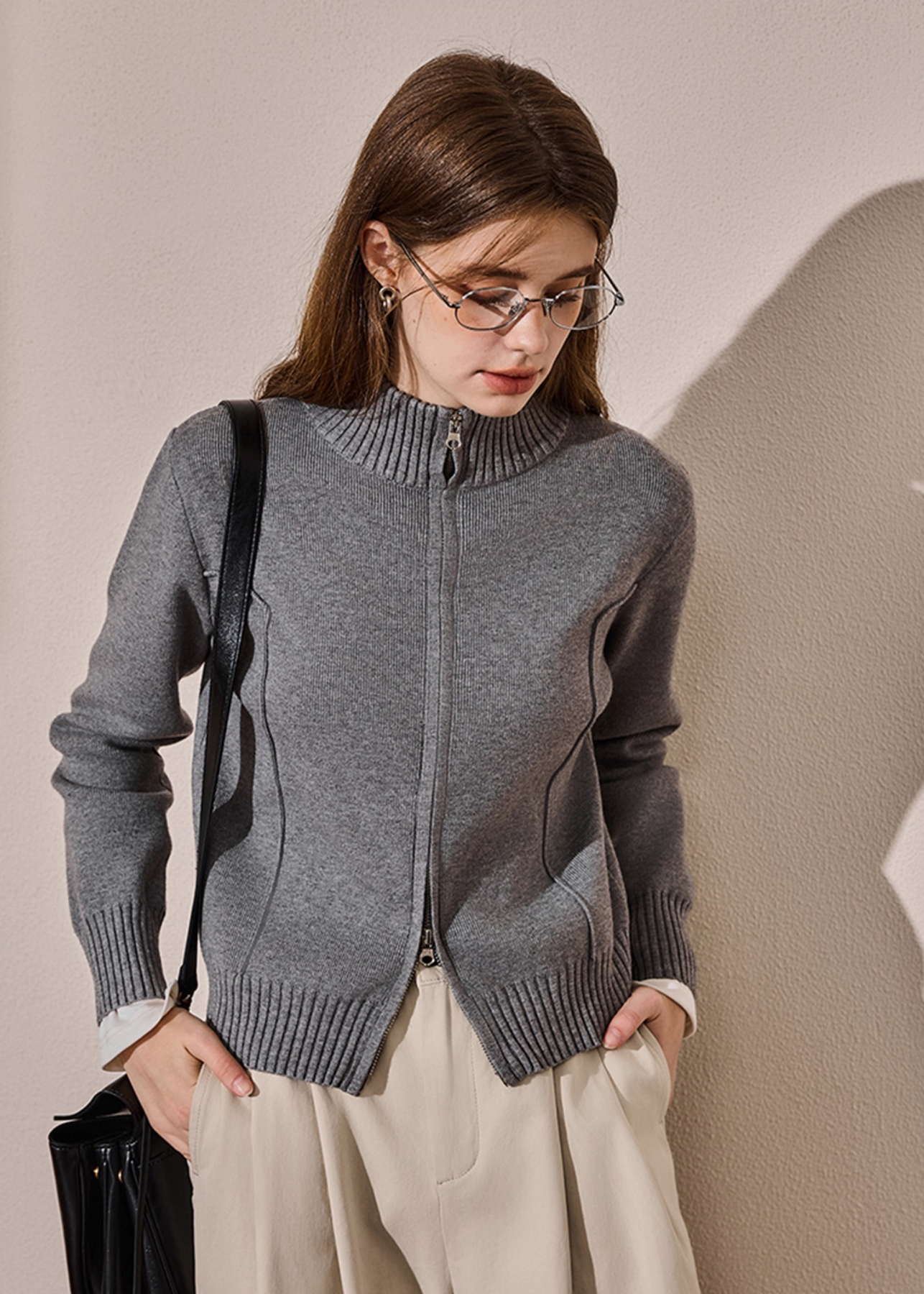 洗練されたグレーが知的な印象を与える、ハイネックジップニットカーディガン。