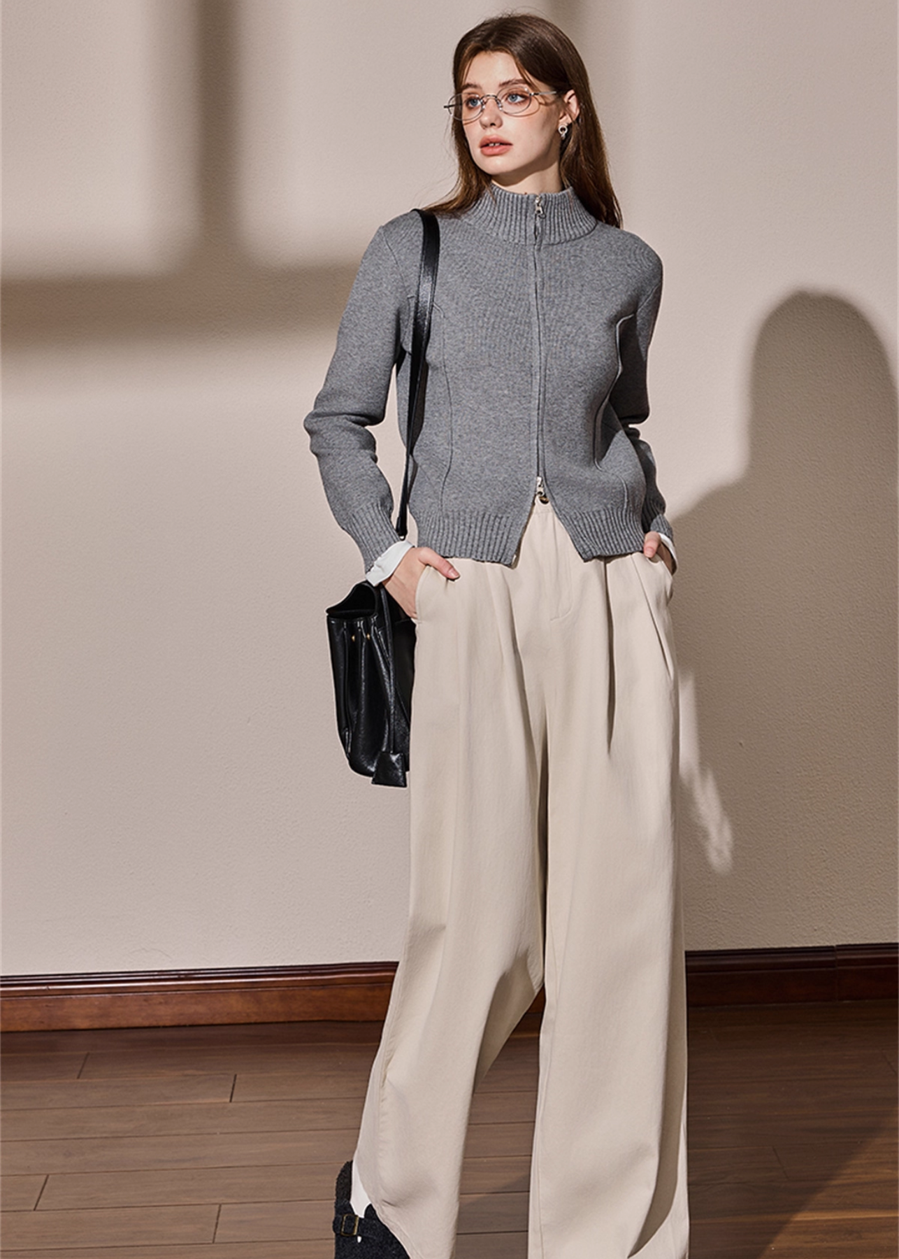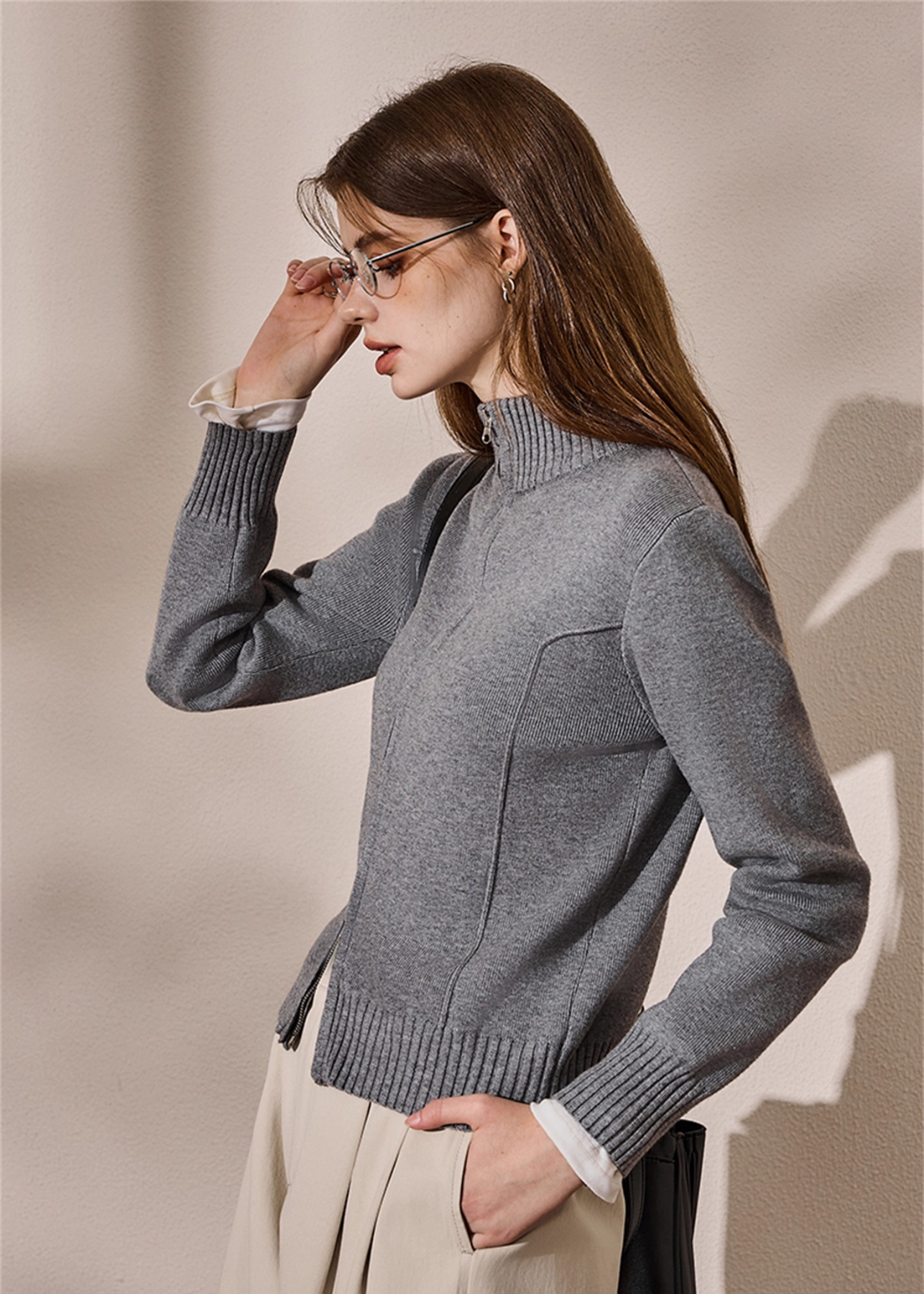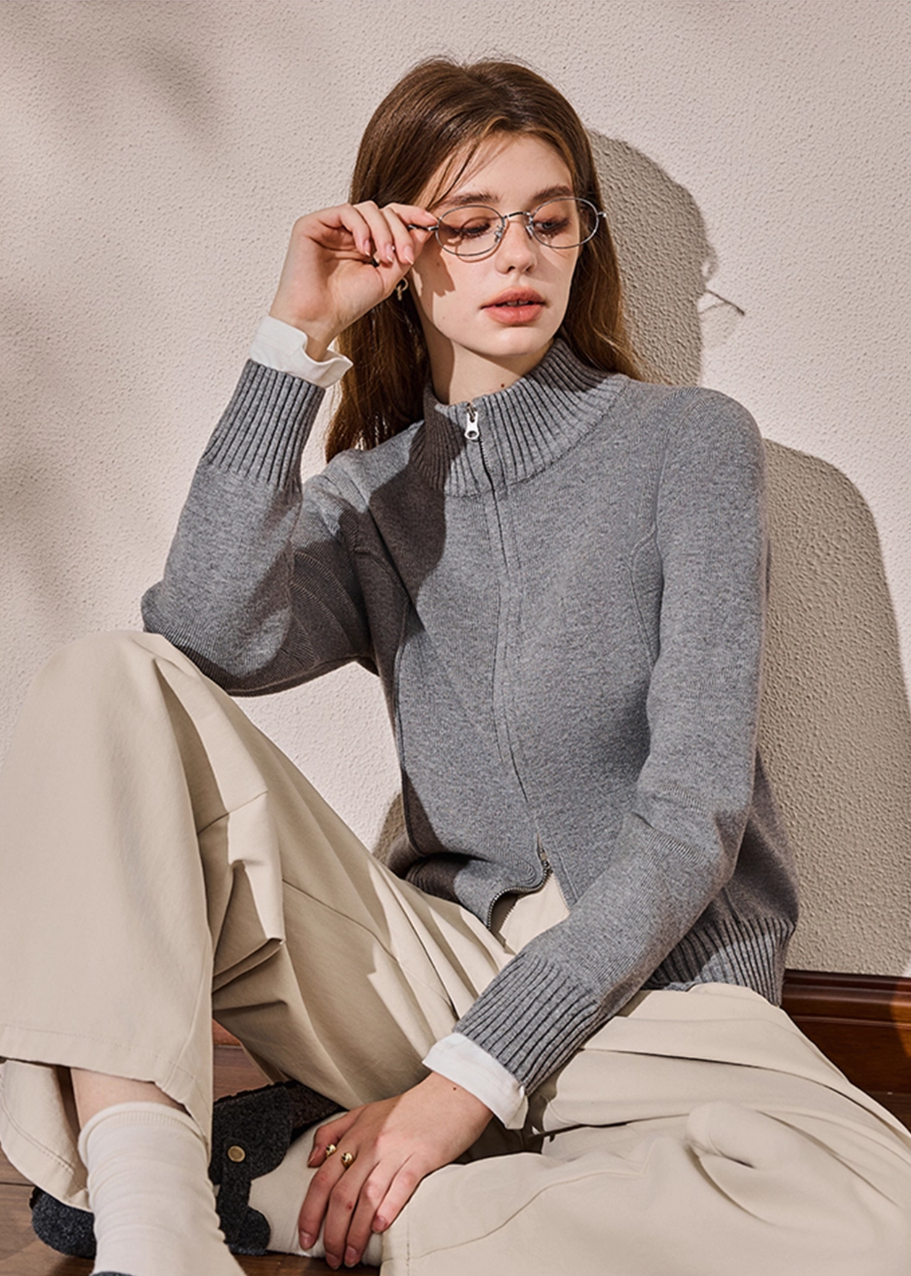 洗練されたグレーが知的な印象を与える、ハイネックジップニットカーディガン。